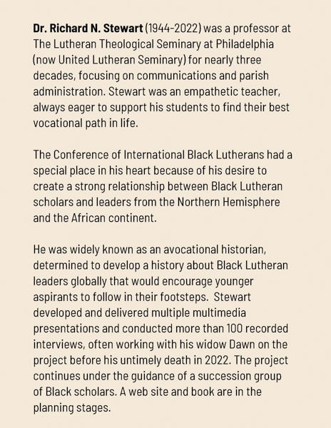 For decades the Rev. Dr. Richard Nelson Stewart, a seminary professor in Philadelphia, took to heart a mission to make use of his communications skills to document the history of Black and Lutheran leaders who were part of the church he loved so their stories could live on. Grover C. Wright, a former Pullman porter turned recruiter of gifted Black leaders to study for rostered ministry, persuaded Stewart he was meant to do this work. Rich served the faculty and students at The Lutheran Theological Seminary at Philadelphia, now part of United Lutheran Seminary. He taught in the areas of media and parish administration for three decades.